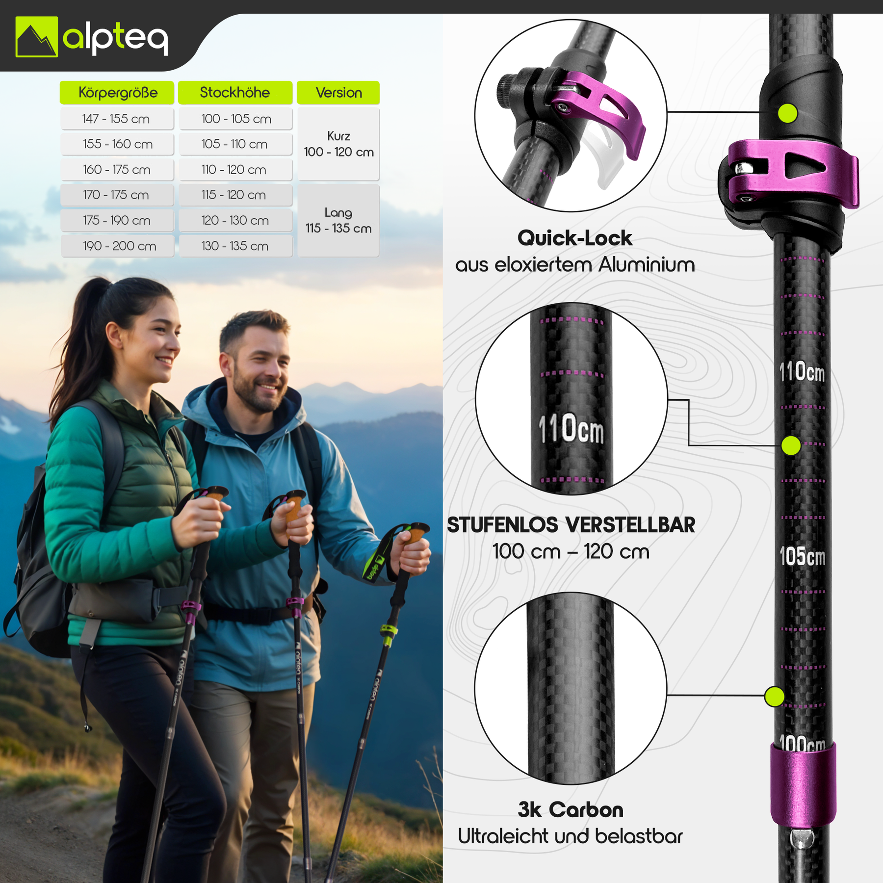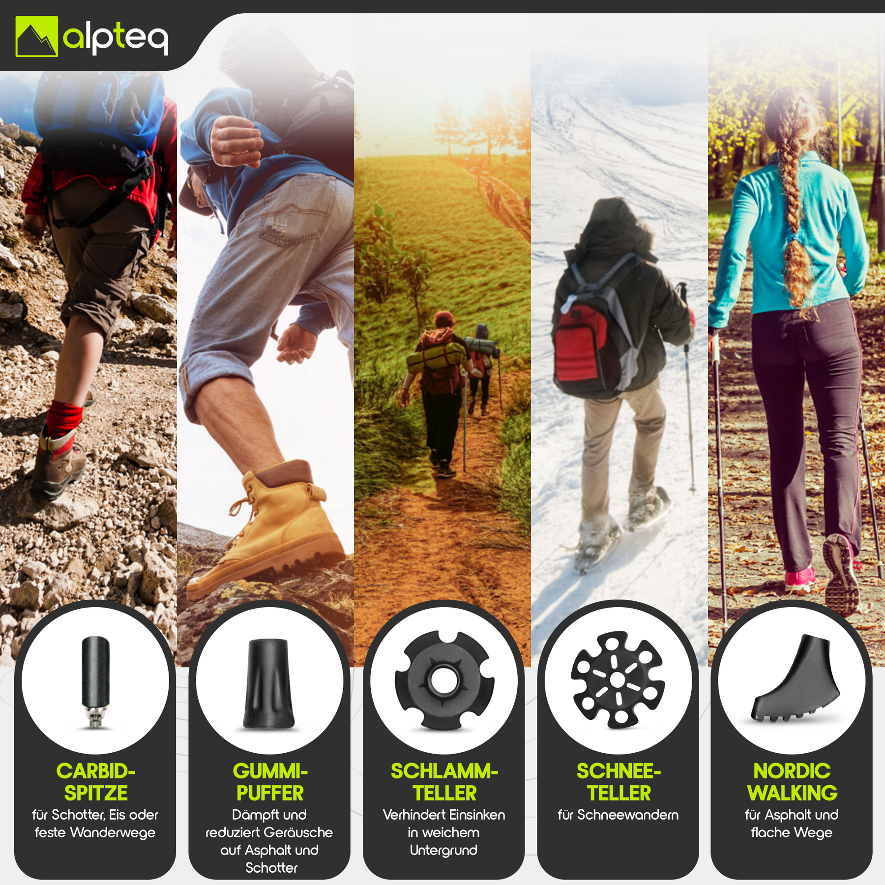The high-quality Alpteq® hiking poles made of super-light carbon are the perfect companion for any outdoor adventure. Weighing just 223 grams, they offer the optimal balance of stability and lightness. The ergonomic cork handle ensures a comfortable grip and support on long hikes. Thanks to the clever folding technology, the poles can be transported in the included hard case, saving space. The set includes practical accessories such as snow baskets, mud baskets, Nordic walking attachments, and rubber buffers. The poles are height-adjustable and are ideal for hiking, trekking, and Nordic walking on any terrain. The robust construction and high-quality materials ensure long-lasting reliability for all outdoor activities.