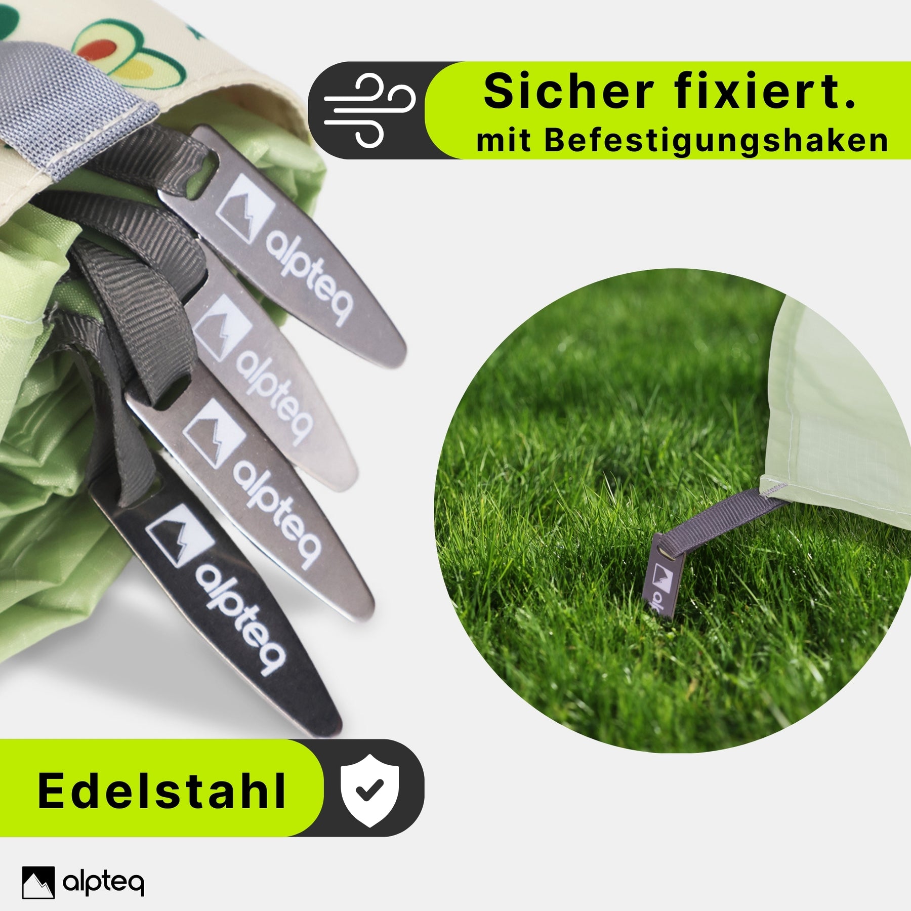 Pegs permanently sewn to the blanket. No more annoying searching or losing them: The four robust fastening pins are directly attached to the picnic blanket. This keeps everything in place – even in windy conditions or on uneven ground.
