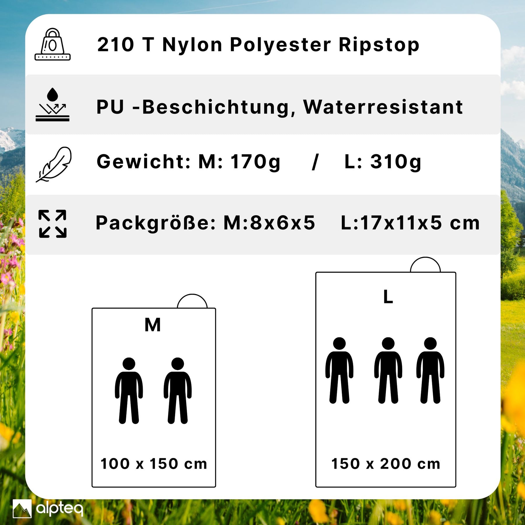 For picnics, camping, the beach, and festivals. Whether hiking, in the park, traveling, or at the lake – the Alpteq outdoor blanket is the ideal mat for two people. It can also be used as a seat, play mat, or temporary rain protection.
